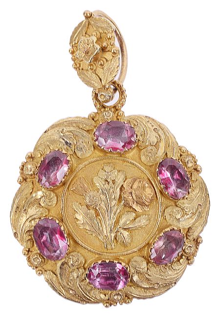 the centre with rose, thistle and shamrock motif within a border of closed set pink topaz ovals and with further fine engraved and cut foliate scroll decoration, matching hanging loop, hair locket to reverse, tests for gold
