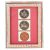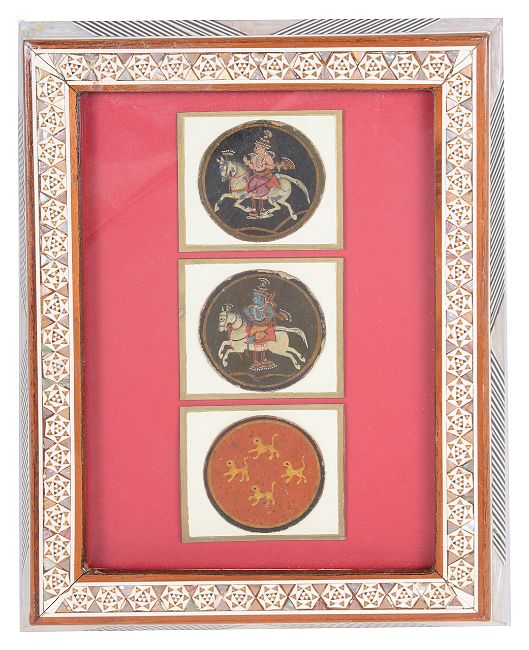 two of the circular cards are court cards and painted with figures on horses, the third a number four numeral card, the three cards mounted and framed
