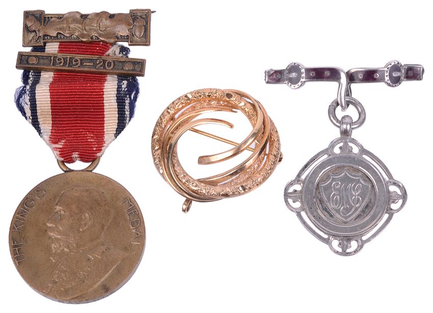 having polished and textured detail, marked to reverse, sold together with an Edwardian silver and enamel ribbon fob brooch with silver fob medal and The King's Medal for Attendance, Conduct and Industry 1919-20 (3)