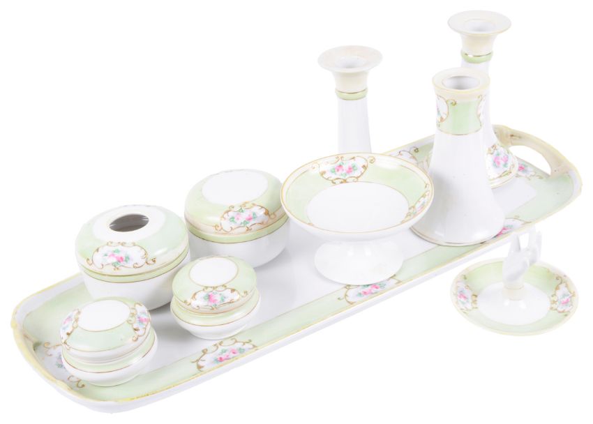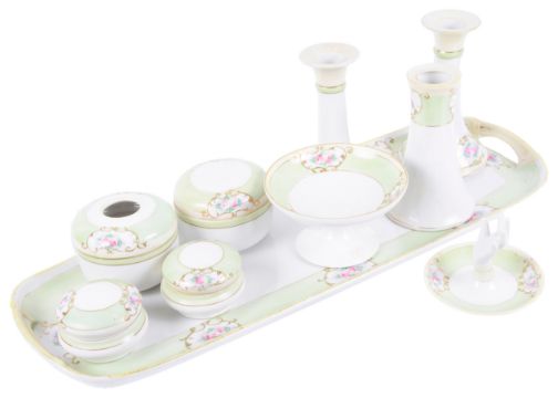A Japanese Noritake porcelain ten piece dressing table suite,
