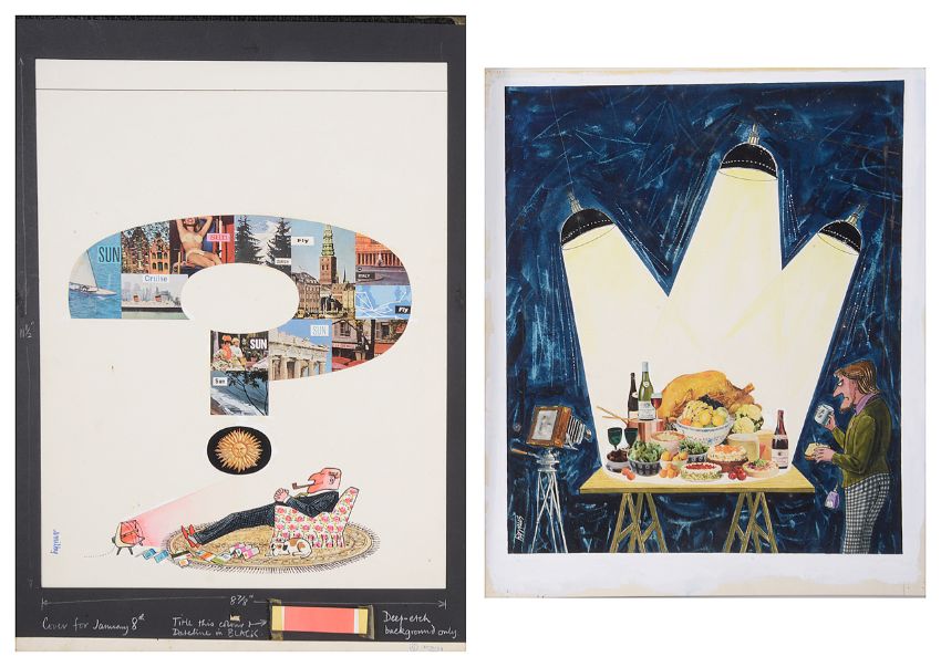 original cover artwork for Punch magazine 8th January 1964, pen and ink with watercolour and applied paper cuttings, on Whatman board, signed lower left, artists notes in margins on applied border, uncaptioned, with dust sheet, together with "Flood lit dinner", original cover artwork for Punch magazine 26th July 1967, pen and ink with watercolour and applied paper cuttings, on Whatman board, signed lower left, uncaptioned, with dust sheet, (2).