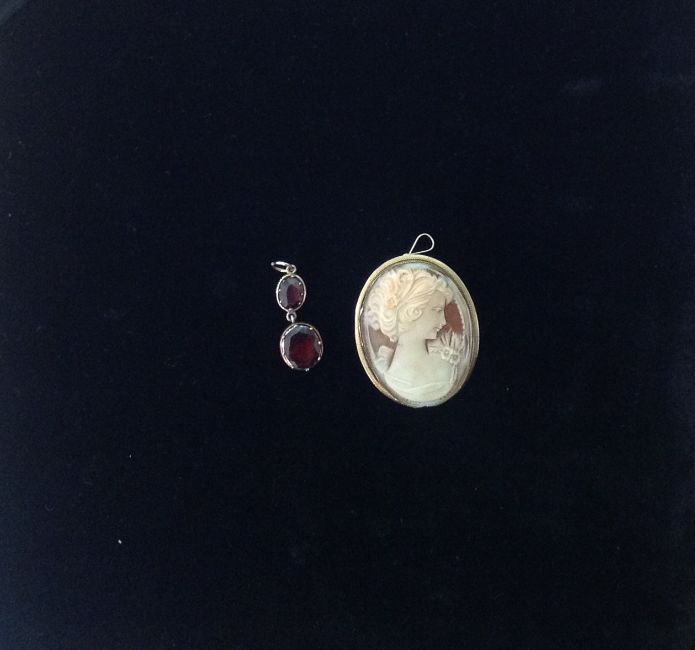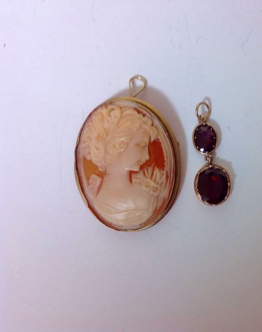 An antique flat cut garnet drop and a gold mounted cameo brooch