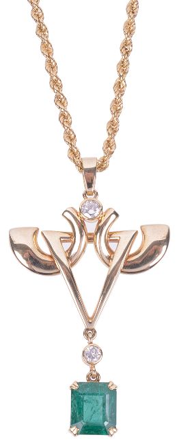 the yellow metal pendant, tests 14ct having collet mounted diamond between scrolls above a smaller diamond set 'triangle' suspended with a rectangular cut emerald, approximately 4.50 ct., the pendant suspended from an 18ct gold rope twist chain