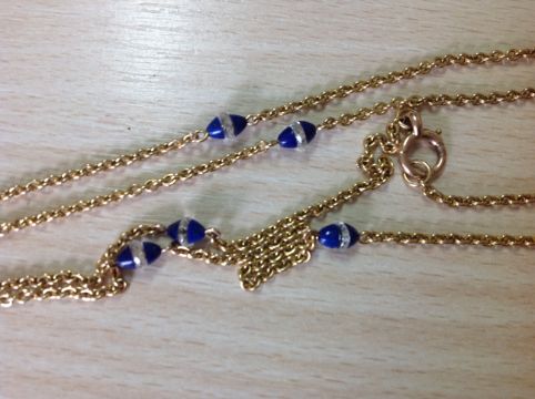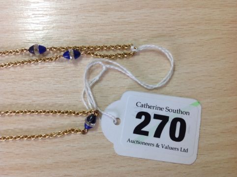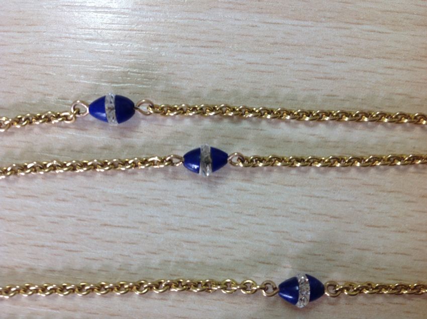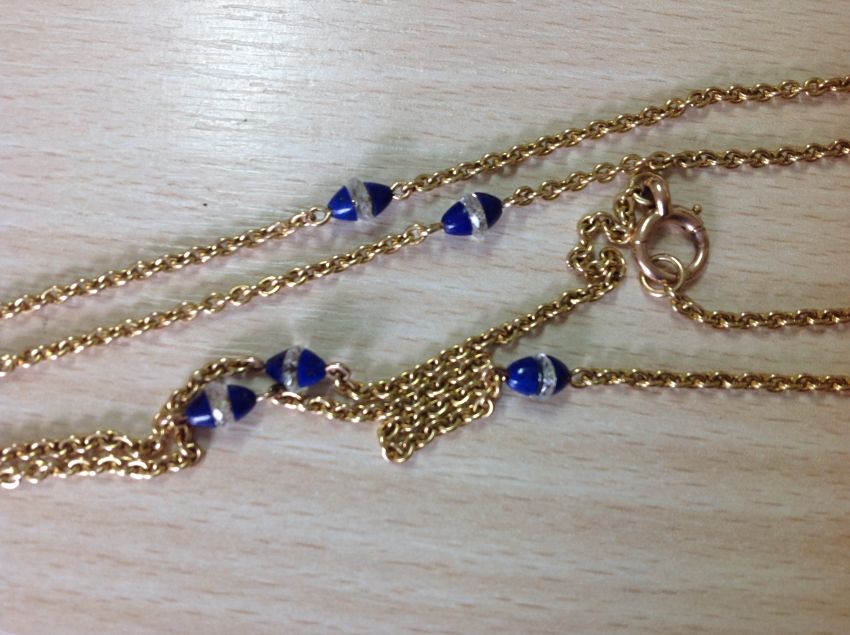the yellow metal chain marked on end ring 15ct and testing for gold, the chain interspersed with three section polished lapis lazuli and rock crystal beads