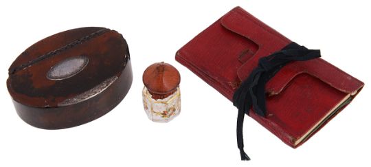 Condition: Fair, with wear and damage to each item, the tobacco box has chips to the edges of the hinged lid and chips to the edges of the base, white metal mounts are not hallmarked; the almanac has wear to the exterior leather cover and interior pages, there is an additional ribbon sewn onto the outer cover; the glass bottle is small with wear to paintwork.