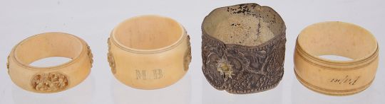 Two late 19th century carved ivory Cantonese napkin rings and two others