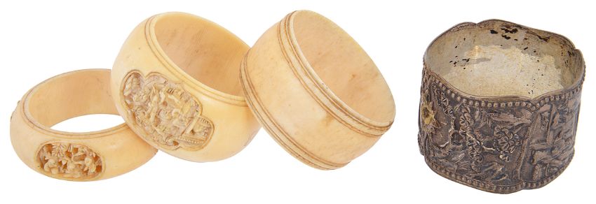 the former finely carved with vignettes depicting figures enclosed within landscape surround with trees, temples and flowers, another ivory napkin ring carved 'Papa', and a white metal napkin ring probably oriental engraved with figures, prunus, blossom etc.. (4)