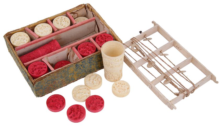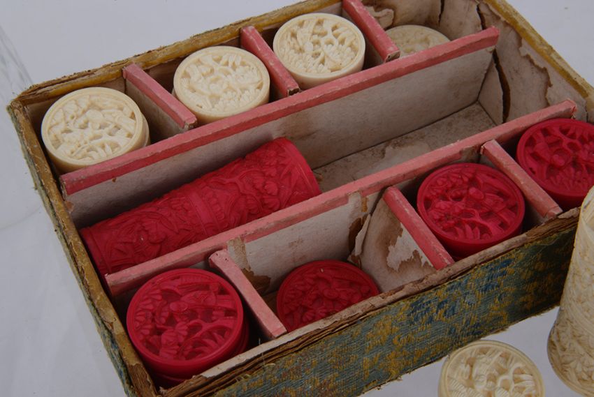 Condition: Fair to good, with wear to each, minor surface scratches to counters and holders, box in poor condition, Chinese puzzle has wear to ivory and string and beads.
