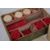 each of circular form carved both sides with figures amongst prunus blossom, in natural and red staining, with two conical holders with ribbed interior lip, with similar carving, in a fitted upholstered box, together with a Chinese carved ivory ladder bead and string puzzle, (32).