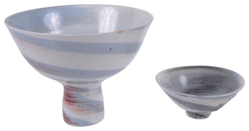 a studio pottery pedestal flared bowl incised with a swirling band of red and pale blue, bears pottery mark together with another squat pedestal bowl with a grey swirling band, bears pottery mark, (2).