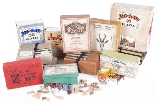 a boxed Britain's Home Farm Series Tumbrel cart No.4F; a boxed Britain's Home Farm Series Horse Roller No. 9F, with other cast animals; three boxed Chad Valley Jig saws comprising of The Fishguard Army 1797, The Gipsy Encampment, Brazenose College Oxford; four boxed Mr Fegans Training Farms for boys jigsaws cut out by Mrs Apperly; a boxed Tuck's zag-saw picture puzzle; a boxed Springbok Series jig saw; a boxed The Academy jig saw puzzle, a/f, (12 boxes).
