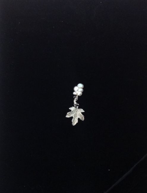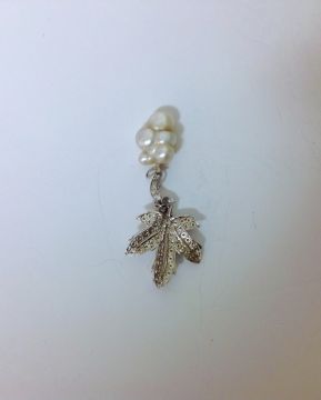 the large baroque pearl in the form of a bunch of grapes with coil detail and yellow metal mount, tests for gold, and suspended from a diamond set 'stalk' and further suspended from a 14K white gold vine leaf with brooch fastening
