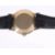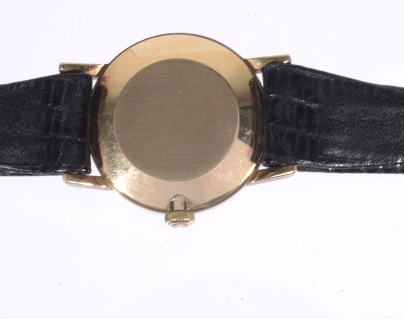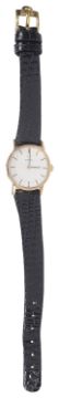 the silvered dial with baton hours and hands, in a circular gold case, with black leather strap.