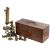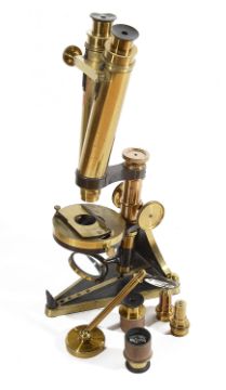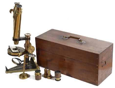serial number 8193, on a triangular shaped base with rack and pinion focussing, micrometer focussing and circular stage, with plano concave mirror and additional eye pieces and objectives, contained within a fitted mahogany case