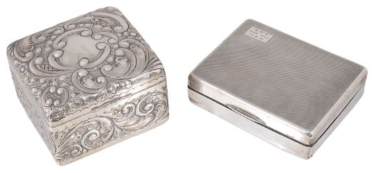 of rectangular form with acanthus leaf embossed hinged lid and sides, with wooden interior by A & J Zimmerman Ltd, together with a silver playing card box, hallmarks rubbed, of rectangular form with engine turned decoration, fitted wooden interior, a/f, (2).