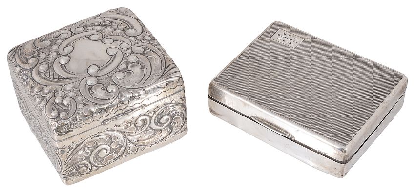 Condition: Fair, with wear to each box, the playing card box the silver is loose from the fitted interior, dents and surface scratches apparent to both boxes, hallmarks rubbed on playing card box.