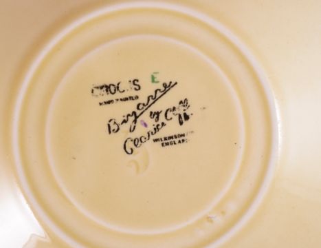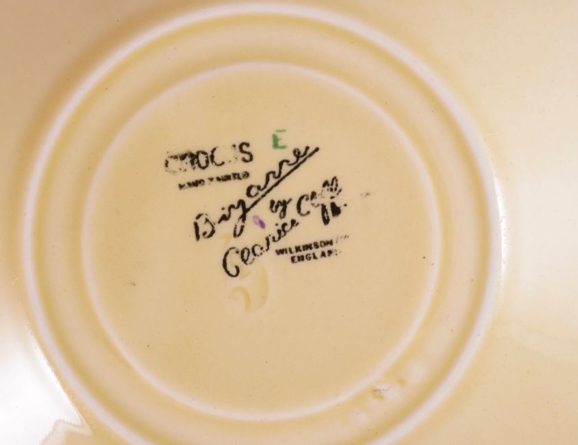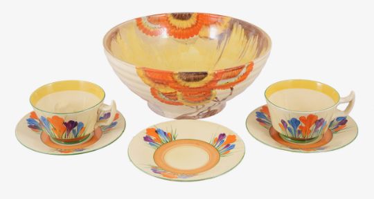 A Clarice Cliff Bizarre "Rodante" pattern bowl and a part set of Bizarre "Crocus" pattern teacups with saucers