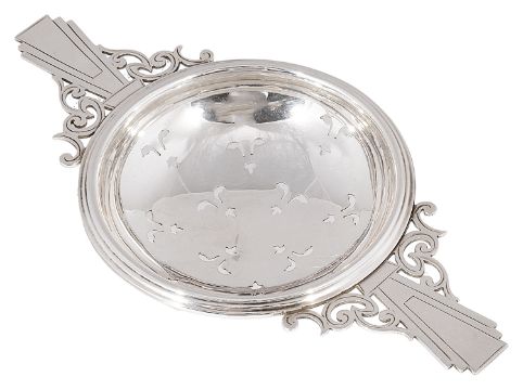 A George VI silver twin handled tea strainer, hallmarked Birmingham 1937