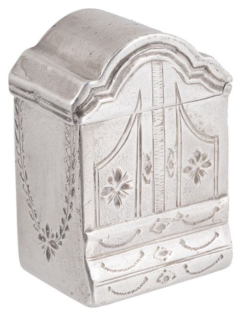 probably Dutch, the domed case with chased detail to the front depicting doors and drawers, the sides chased with garlands and the reverse with trophy
