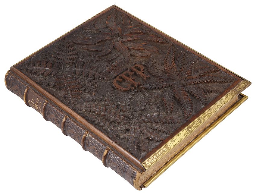 A heavily carved wooden and brass bound book by Richard Pigot entitled 'The Life of Man symbolised by the months of the year', 1886