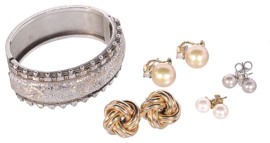 Four pairs of earrings and a Victorian silver stiff bracelet