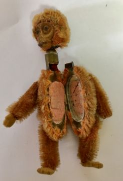 in mohair fur around a metal body, with removeable head revealing a lipstick holder, compact and mirror and with moveable arms and legs, a/f