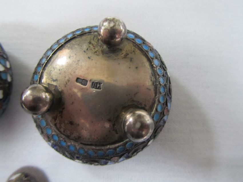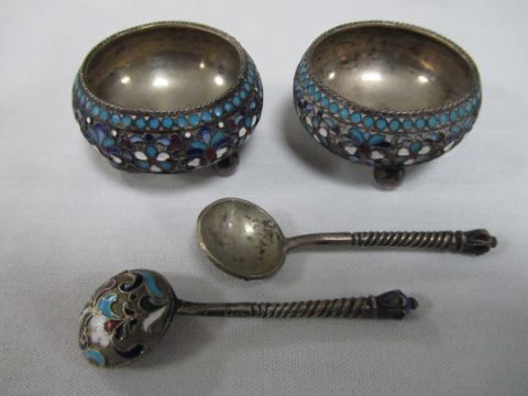 A pair of Russian silver and cloisonne salts with spoons