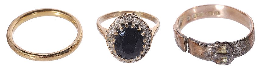 the mount marked for 9ct gold, together with a narrow 22ct gold wedding band and a 9ct rose gold buckle ring a.f. (3)