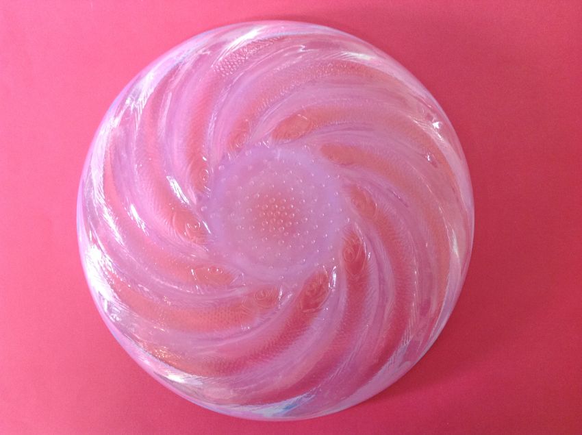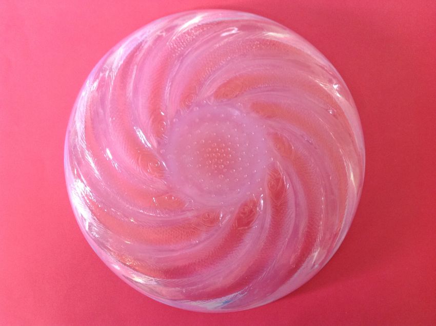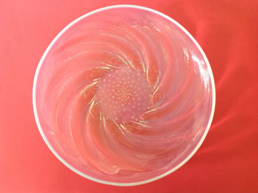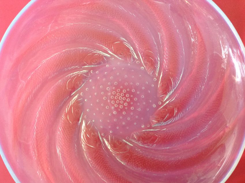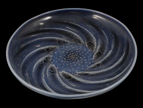 the circular opalescent dished plate, with R Lalique raised mark to centre.