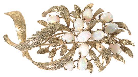 A large Continental 18k gold and opal floral spray brooch of raised foliate scroll design, the brooch set with twelve oval opals and with engraved detail to leaves total weight 13.2g, length approx 8cm.  This is marked 18k and tests for gold. Condition: All stones in good condition. Little signs of wear