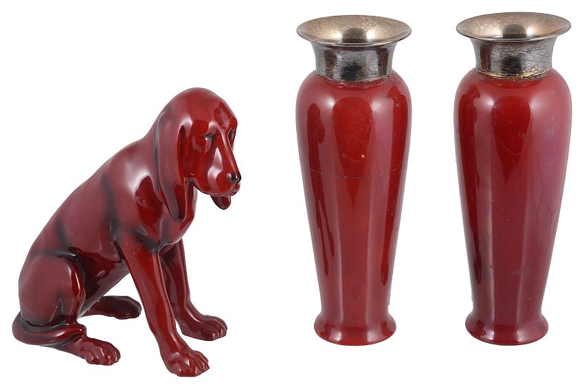 in seated pose, together with a pair of white metal mounted Royal Doulton flambe vases, a/f, (3).