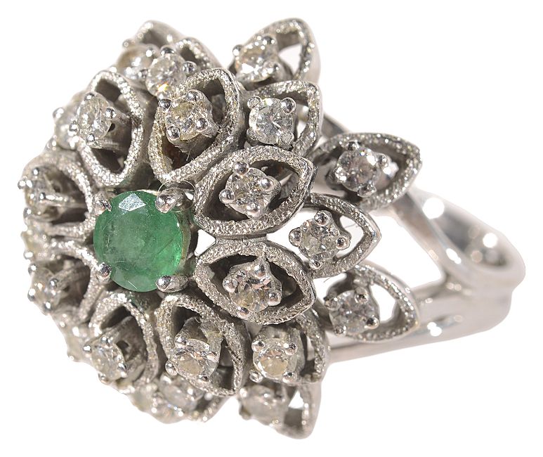 in raised tiered floral setting with centre emerald surrounded by numerous brilliant cut diamonds in lozenge shaped setting