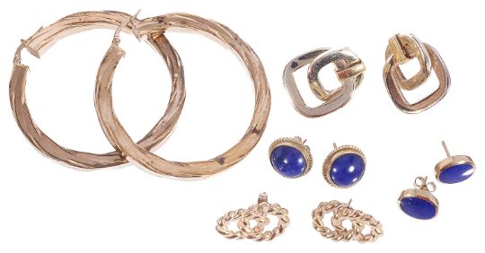 to include a pair of modernist 18ct gold 'double square' design earrings, two pairs of 9ct gold mounted lapis lazuli stud earrings, a large pair of yellow metal hoop earrings and a pair of rope twist design earrings (5)