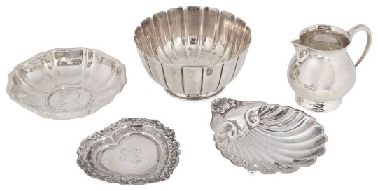 the scalloped bowl hallmarked Birmingham 1961 by Henry Clifford Davis; the cream jug of small proportions hallmarked Birmingham 1961 by Barker Brothers Silver Ltd; a heart shaped trinket dish with foliate border hallmarked Birmingham 1982 by RE Porter; a scallop shaped trinket dish hallmarked Birmingham 1973 by David Hollander & Son and an octagonal trinket dish with Marie Theresa Thaler coin base hallmarked 800, (5).