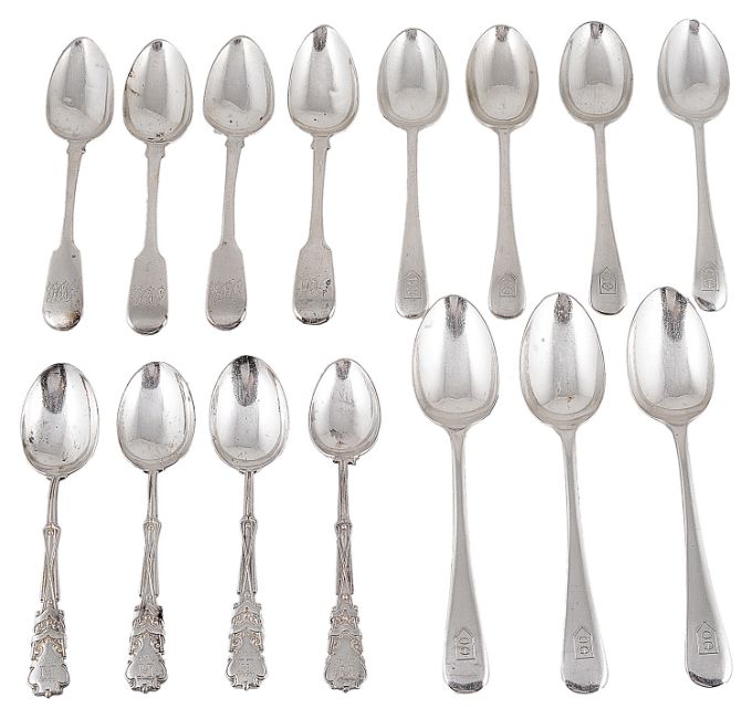 five hallmarked Sheffield 1955 by Atkin Brothers; four hallmarked London 1813 by Charles Boyton; four hallmarked Birmingham 1957/1958 by James Fenton & Co; two hallmarked Sheffield 1948/1950 by Gladwin Ltd, (15).