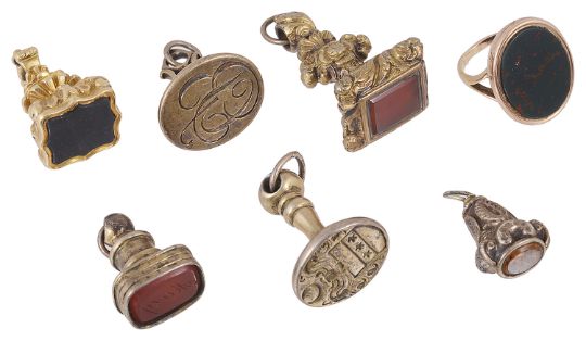 to include a Georgian silver gilt oval monogram seal, maker possibly Thomas Austin, another Georgian seal, tests silver gilt bearing armorial, a Victorian yellow metal, bloodstone set seal, tests for gold, a carnellian set larger scroll seal and two smaller pendant seals one set with a carnelian intaglio bearing the word 'Many', sold together with a Victorian oval bloodstone set ring, tests for gold (7)