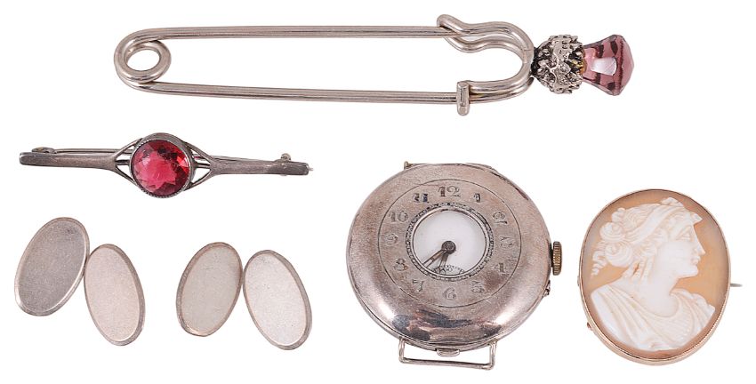 together with a silver cased half hunter wristwatch, a pair of oval silver cufflinks a.f. and two white metal mounted brooches (Q)