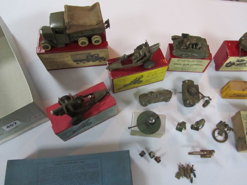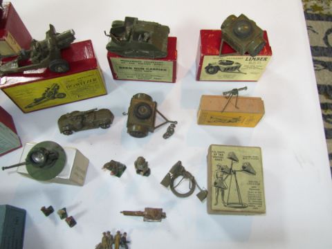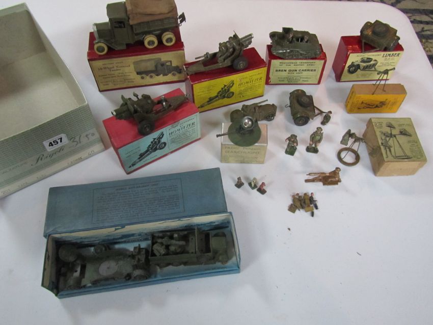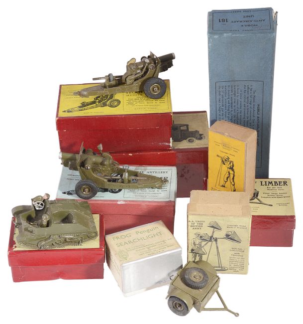 to include two Royal Artillery 4.5" Howitzer Muzzle Loading; a British Army 10-wheel covered tender; a Bren Gun Carrier with crew; a Copyright model; a Sound Locator; two Royal Artillery Limber; together with a boxed Frog Penguin Searchlight and a boxed Meccano Mobile Anti-Aircraft Unit, a/f, (10).