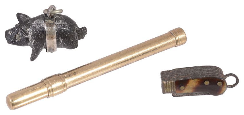 A Sampson Mordan yellow metal retracting toothpick and a miniature tortoiseshell six blade penknife and a wooden miniature pig pendant with metal band, a/f, (3).