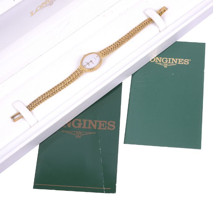 the oval dial with roman numeral 12 and 6 hours and Longines logo, quartz movement, in a 9K gold case with herringbone pattern bracelet, case numbered: 0624963, case and bracelet stamped 375/9K, in original Longines box with certificate of origin.