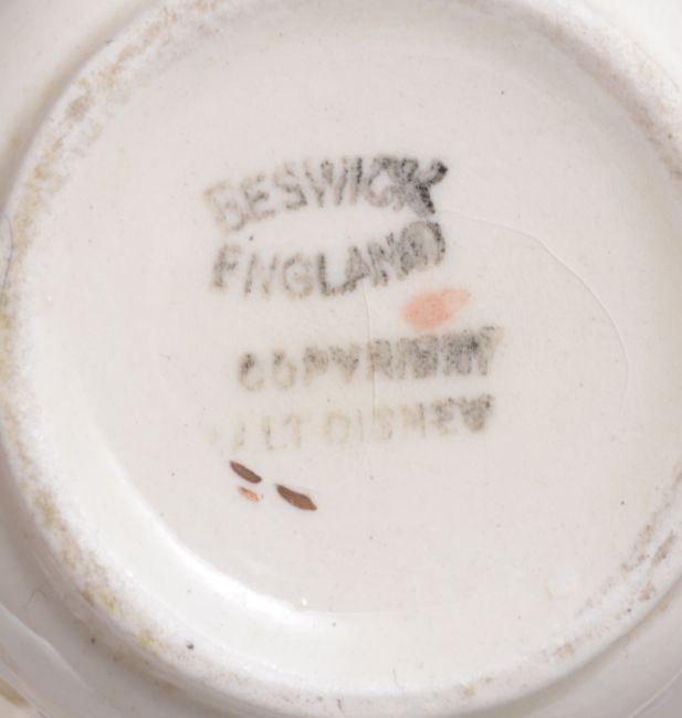 comprising a teapot, cream jug, sugar bowl, two teacups with saucers and two side plates, each bearing Disney characters, bearing factory marks to bases, (9).