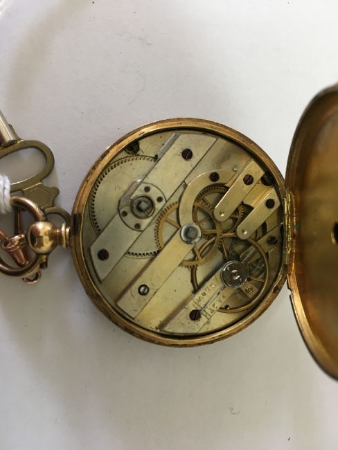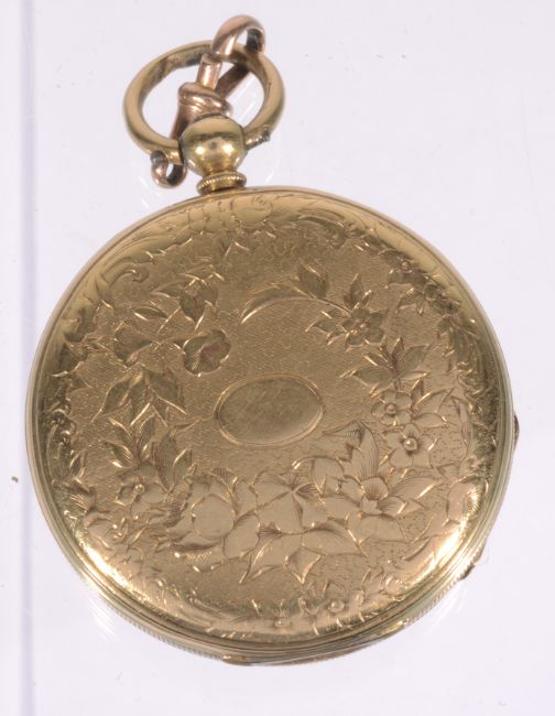 the gilt metal dial with roman hours surrounding foliate engraved centre, with spade hands, the case back with floral swags and blank cartouche, with a watch key.