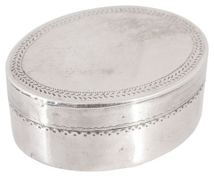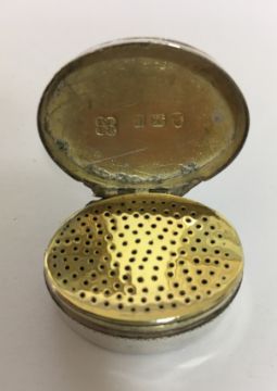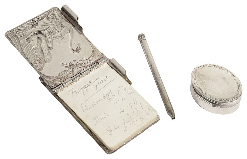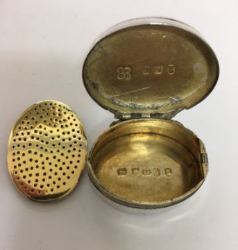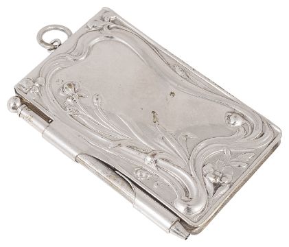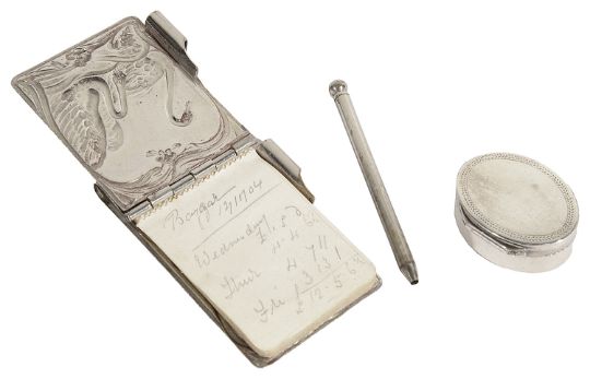 of oval form with leaf engraved border decoration, hinged cover revealing a pierced silver gilt grille, by Thomas Phipps & Edward Robinson; together with an Art Nouveau white metal aide memoire, with hinged cover with embossed swan decoration, pencil and notepad, (2).