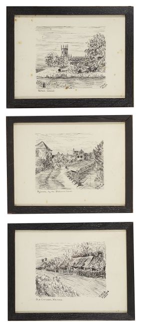 together with three framed etchings 'Old Cottage', Rylands by the Beeston Canal' and 'Wilford Church', each framed and signed O.M.E.A 8.12.1906 & 11.12.1906, (5).