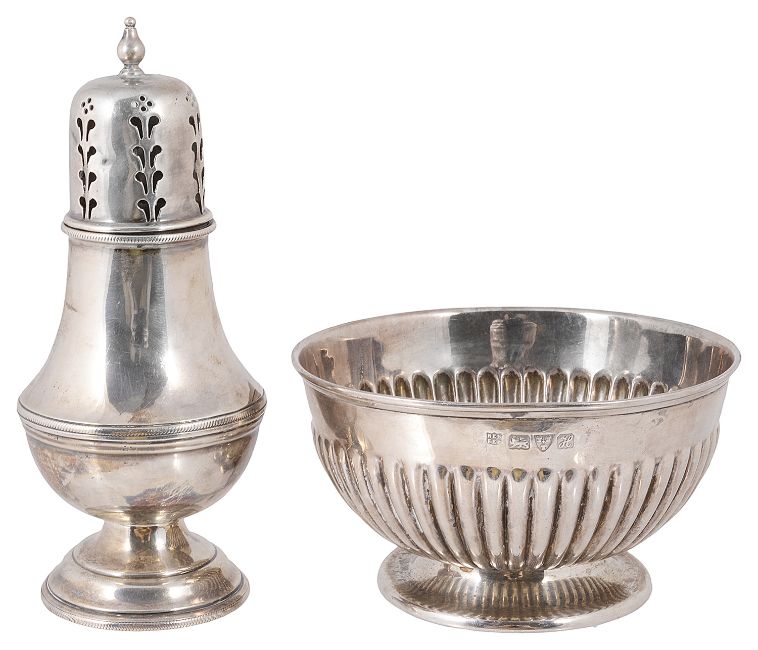 of typical baluster form with pierced domed top by James Dixon & Sons Ltd and an Edwardian silver circular pedestal bowl hallmarked Sheffield 1908 by Barkers Brothers, (2).