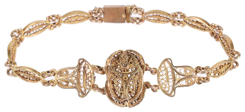having central raised filigree scarab with fancy filigree panels to either side and further smaller panel links, marks to several sections,