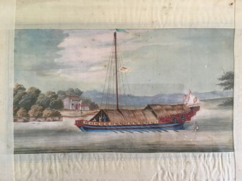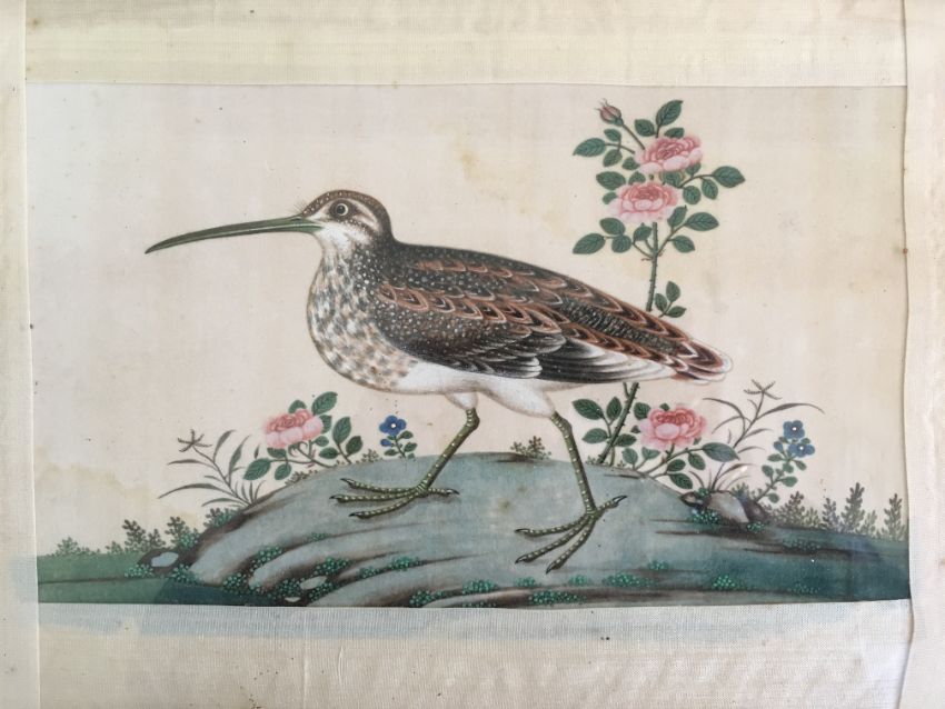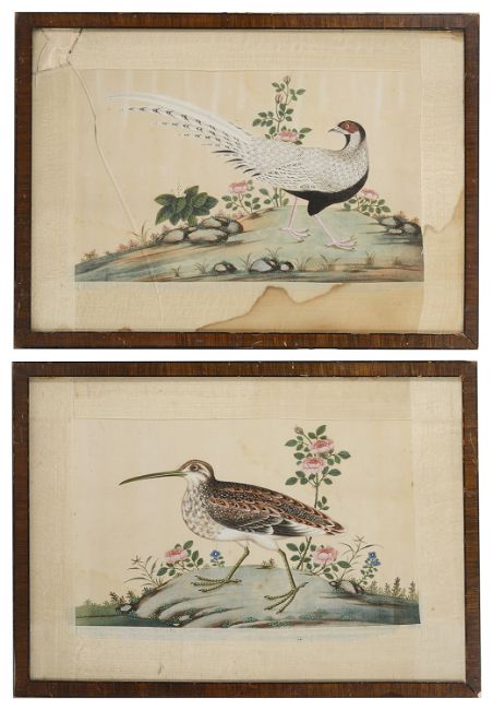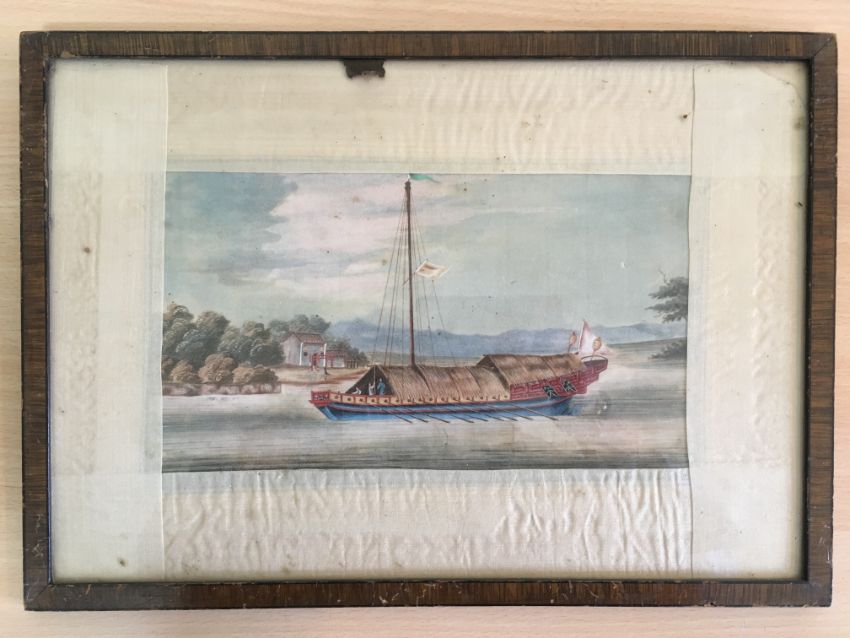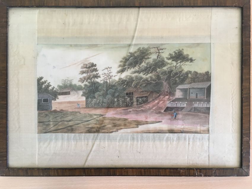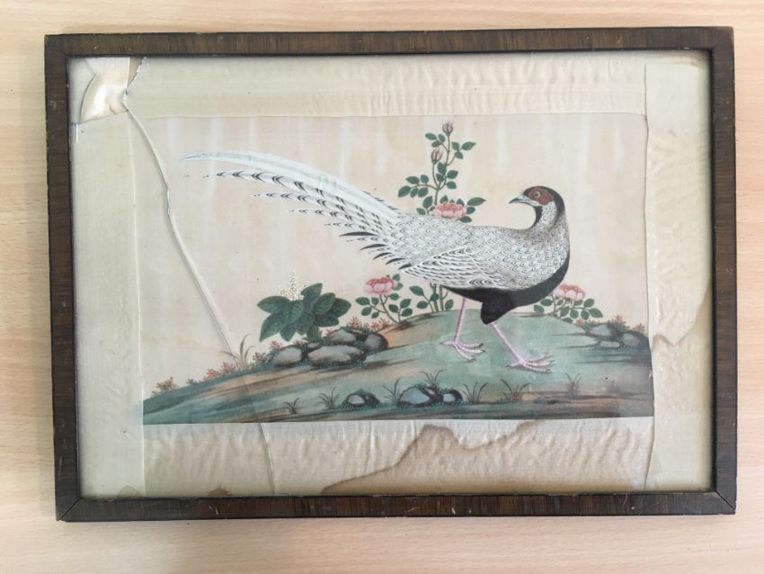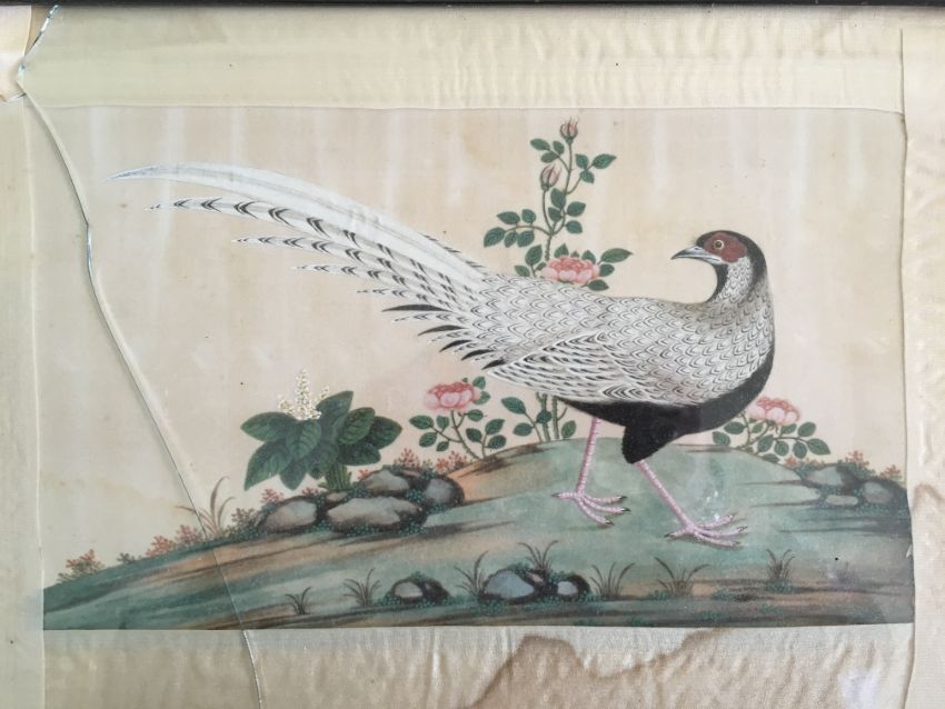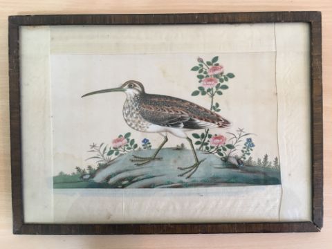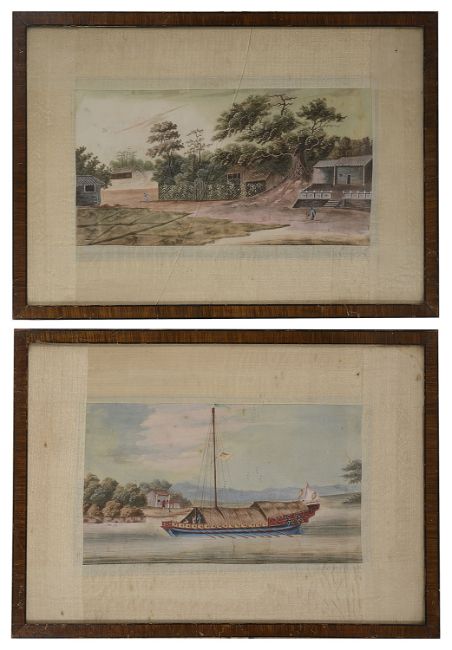 including a grebe bird, a junk and a landscape scene finely detailed, each glazed and framed, (4).