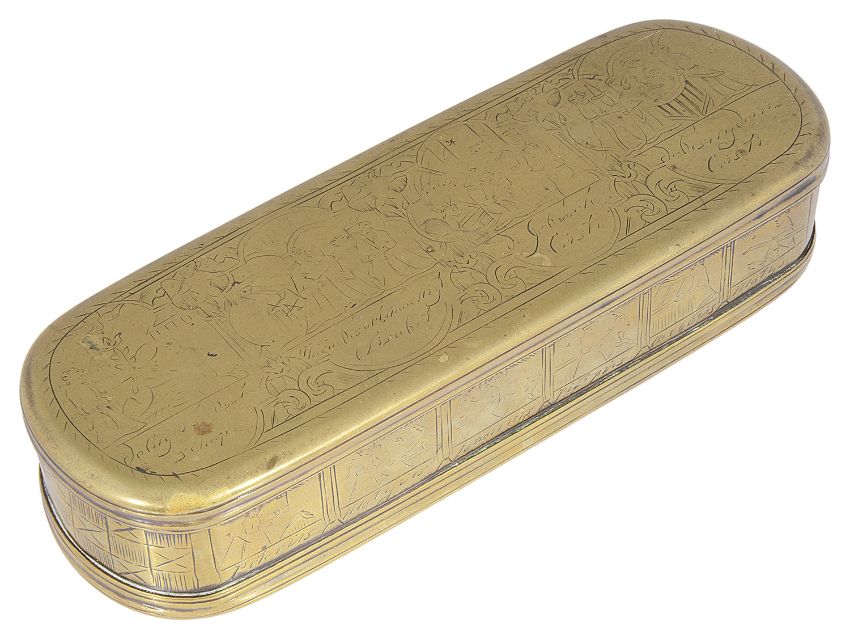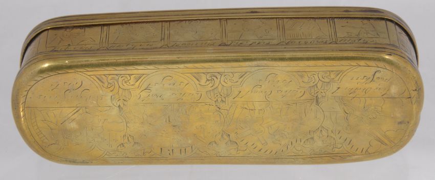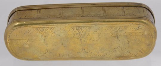 of oval form, the lid lightly inscribed with illustrations of the life of Christ, the sides also inscribed with biblical scenes
