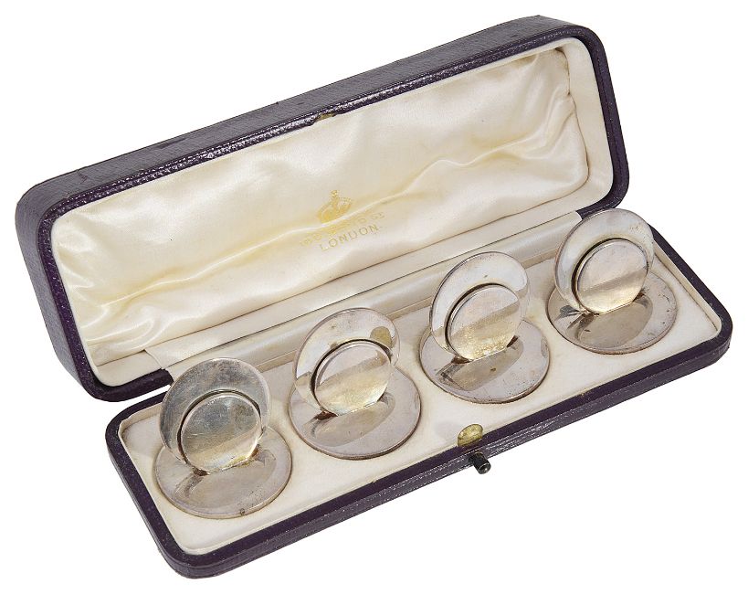each menu card holder of circular disc form with circular base, each with RD No. 402227, contained within a fitted case, (4).
