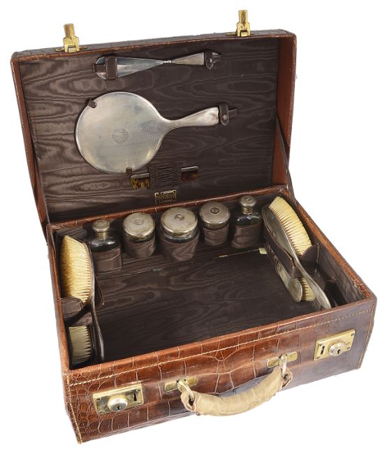 of rectangular form with gilt metal english lever locks, leather handle, the moire silk lined fitted interior with silver mounted dressing table bottles and brushes, hallmarked Birmingham 1919/1923 by Deakin & Francis Ltd, comprising of two clothes brushes, two hairbrushes, hand mirror, two scent bottles and three powder pots, shoehorn and comb, hallmarked London 1939, the exterior of the case embossed with gilt initials ET, bears makers stamp.